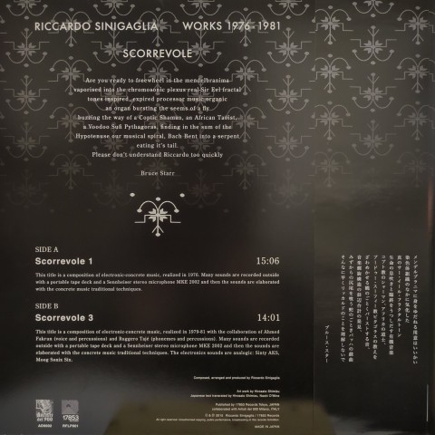 Chee Shimizuによるレコード・ショップOrganic Musicのレーベル17853 Recordsから2015年に第一弾としてリリースされた、イタリアの実験音楽家Riccardo Sinigagliaの未発表含む1976〜81年録音の音源を収録した一枚。アナログ・シンセサイザーによる電子音、水の音や鳥のさえずりなどのフィールド・レコーディング音、パーカッションによって独自の音世界を構築したエレクトロニック・ミュージック・コンクレート作品。