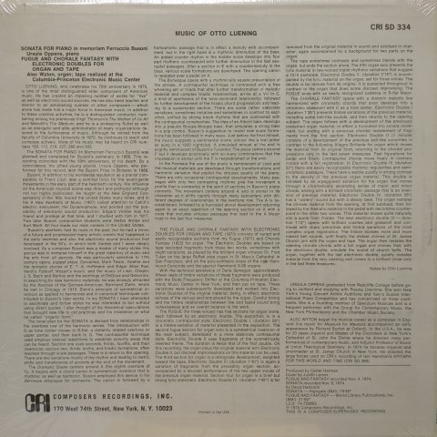 米国における電子音楽の先駆者の一人、現代音楽作曲Otto Lueningの75年作。A面にドイツ系イタリア人の作曲家/ピアニストFerruccio Busoniに捧げたピアノ・ソナタを、B面にオルガンとテープによる楽曲を収録。コロンビア・プリンストン電子音楽センターでモジュラーシンセを用いてテープに録音した電子音をオルガンとミックスさせた、なんだかオルガンも電子音に聴こえてくる?B面が激オススメ!