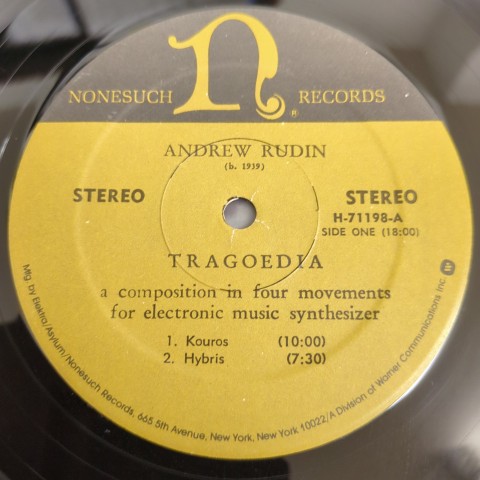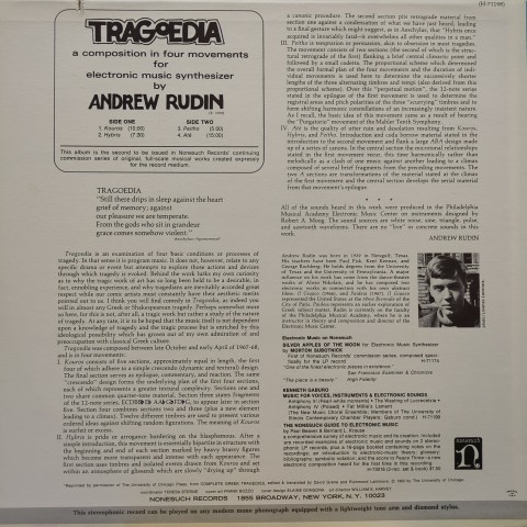 ミュージック・コンクレートの創始者Pierre Schaefferや電子音楽巨匠Stockhausenに影響を受けたアメリカの作曲家Andrew Rudinが、US名門レーベルNonesuchから電子音楽制作の委託を受け当時最新だったモーグ・シンセサイザーを用いて作られた68年作。モーグが宇宙空間を縦横無尽に動き回るぶっ飛び電子音楽傑作。Andrew Rudinはイタリアの映画監督Federicoの69年作「サテリコン」のサントラ(妄想民族音楽名作!)にも参加しています。