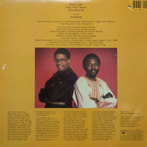 ジャズ・ピアニストHerbie Hancockと西アフリカ・ガンビア出身のグリオと呼ばれる階層の音楽家Foday Musa Susoが共同制作した85年作。Herbie Hancockの浮遊感のあるシンセサイザーとFoday Musa Susoによる西アフリカの伝統撥弦楽器「コラ」の美しい響きが共鳴した極上エスノ・ジャズ。