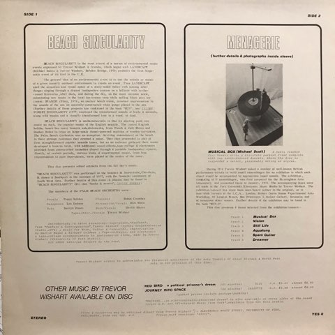 鳥や動物の鳴き声、人間の喘ぎ声、絶叫、鼻息なんかを電子変調させた激ヤバ盤『Red Bird』でも知られる異色の子供音楽教育者でイギリス電子音響実験の先駆者のひとりでもあるサウンドアーティスト/作曲家Trevor Wishartの79年作。77年の夏に様々なビーチで行われた、テープ・コラージュや電子音も交えたインプロヴィゼーションを編集抜粋したサイドA「Beach Singularity」、奇っ怪なオブジェを制作しそのオブジェのためのイメージ・サウンドを収録したサイドB「Menagerie」。両面ともめちゃくちゃ面白い!アヴァン好きはマスト!