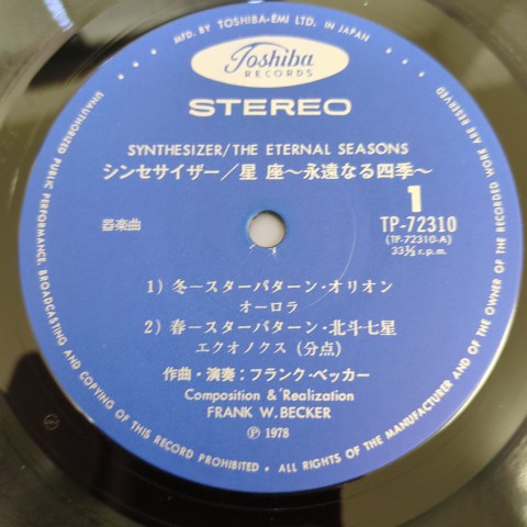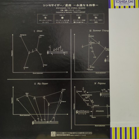 日本に長期間滞在し武満徹や高橋アキ、一柳慧ら現代音楽家と実験音楽の作曲、演奏、制作、録音もしていたアメリカの作曲家/電子音楽家Frank W. Beckerの78年作。星座にインスピレーションを受けシンセサイザーで表現したという、鳥のさえずりや波の音など環境音もミックスされたディープ・エレクトロニクス作品。日本オンリー盤です。