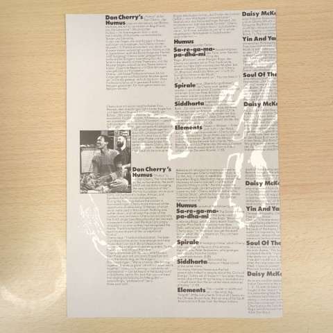 A面とB1にDon Cherry & The New Eternal Rhythm Orchestraの演奏を、B2にポーランドの現代音楽家PendereckiがThe New Eternal Rhythm Orchestraをコンダクトした演奏を収めた、71年ドナウェッシンゲン音楽祭でのライブ音源。Han Bennink、Terje Rypdal、Peter Brötzmann、Albert Mangelsdorff、Willem Breukerなど錚々たるメンツが参加。オーガニックでスピリチュアルなエスノ・フリージャズのDon Cherry、強烈に前衛的なPendereckと両者ともの個性が良く出た名作ライブ。