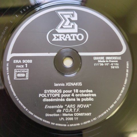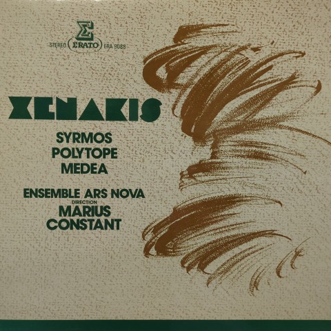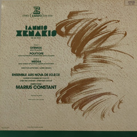 フランスが誇る現代音楽作曲家で建築家でもあるIannis Xenakisのオリジナルは71年に仏Eratoからリリースされた、18弦楽のための「Syrmos 」、管弦楽曲「Polytope」、声楽と管弦楽のための「Medea」を収録した一枚。特にA面に収録された59年作曲の「Syrmos 」と67年カナダ・モントリール万博でのXenakisが担当した彫刻・ライトショー・音楽によるインスタレーションのために作曲された「Polytope」は、とても生楽器だけとは思えない電子的な響きすら感じさせる凄まじいオーケストレーションによって幾何学模様の音世界に放り込まれるような、Xenakisでしかありえない音響体験ができる傑作です。強烈!