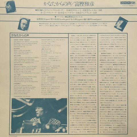 日本における最重要パーカッショニストのひとり、富樫雅彦が翠川敬基 (b, cello, perc)、加古隆(p, perc)、藤川義明(reed, perc)というパーカッションメインの編成で録音した78年作。フリー寄りのものから音数の少ないアンビエント的演奏やミニマルな楽曲まで、様々な表情を見せる富樫のパーカッションの響きや音色を聴いてるだけでも楽しめる先鋭的な一枚。