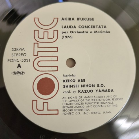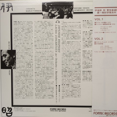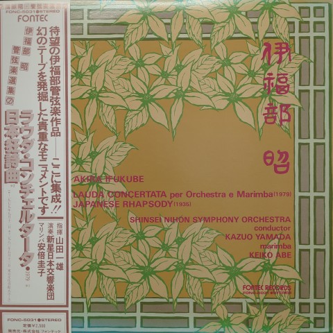 「ゴジラのテーマ」で知られる日本を代表する現代音楽作曲家、伊福部昭の代表曲であるマリンバとオーケストラのための「ラウダ・コンチェルタータ」と「日本狂詩曲」の初演ライブを収めたレコード。「ラウダ・コンチェルタータ」は安倍圭子のミニマルで強烈な打点のマリンバと原初的で荒々しいオーケストラによって狂乱状態にまでもっていかれる圧巻の演奏。「日本狂詩曲」の第2章「祭り」はその名の通り日本のお祭りを連想させるお囃子のようなフルートとピッコロから躍動していく伊福部らしい日本的情緒とダイナミズムに溢れた作品。両曲とも強烈です!