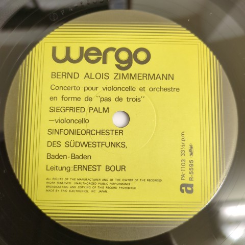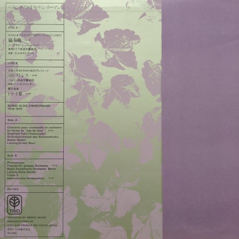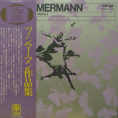 1918年ドイツ生まれの現代音楽家B.A. Zimmermannの死後Wergoからリリースされた72年作。A面を占める、マンドリン、エレクトリック・ギター、ダルシマー、ミュージカル・グラス、ハープ、ピアノ、打楽器による不協和な響きの「Pas De Trois」、凄まじいトーン・クラスターが迫ってくる「Photoptosis」、大阪万博のために作曲された電子音響作品「Tratto II」の3曲を収録。杉浦康平デザインのシルクスクリーン・プリントによる日本独自ジャケも素晴らしいです。