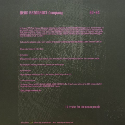 78年にドイツでPeter ElsnerとBenjamin Heidersbergerによって設立され音楽や映像、パフォーマンス、インスタレーションなど様々な芸術分野で活動していたプロジェクトHead Resonance Companyの1980〜84年のセッションを収めた一枚。80'sベルリン・アンダーグラウンド発掘レーベルV.O.Dから2004年にリリース。アブストラクトでミニマルな激ヤバ電子音楽をこれでもかと収録してます。