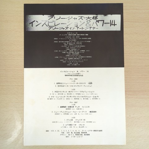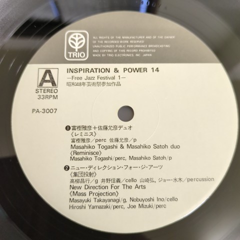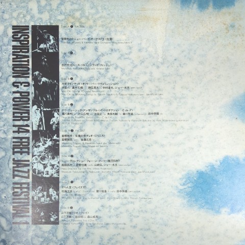 1973年7月に東京・アートシアター新宿文化劇場で開催された伝説的な14夜連続「フリー・ジャズ大祭」の模様を収録した2枚組アルバム。宮間利之とニューハードオーケストラ、吉沢元治、沖至クインテット、富樫雅彦+佐藤允彦デュオ、山下洋輔トリオなどの圧倒的なパフォーマンスを収めた日本フリージャズ史における記念碑的作品。試聴は2024年には完全版が発掘リリースされた高柳昌行率いるNew Direction For The Artsによる凄まじいノイズの「Mass Projection」、アルトとピアノのユニゾンによるドレミファが崩壊してカオスになだれ込むNow Music Ensemble「C De F」、佐藤允彦のシンセサイザーやエレピがのたうち回るがらん堂「Phase 13」から。