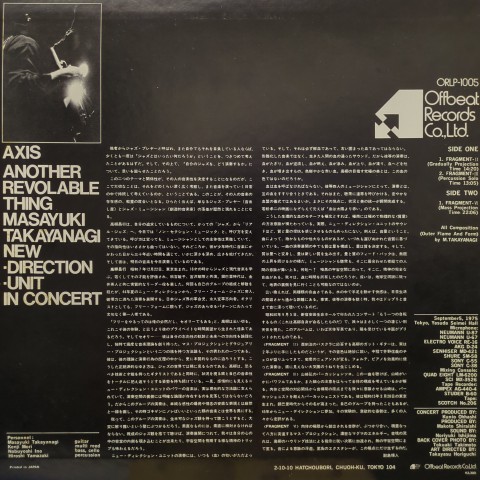 大友良英の師でもある高柳昌行率いるニュー・ディレクション・ユニットによる1975年9月5日、新宿・安田生命ホールでのライブを収めた一枚。音数の少なく先鋭的な演奏が音宇宙を構成する「Fragment - II」、パーカッショニスト山崎弘のソロによる「Fragment - III」、そしてなにより最初から最後まで圧倒的なエネルギーでもって凄まじい音塊を創り出していく「Fragment - VI」が強烈!!