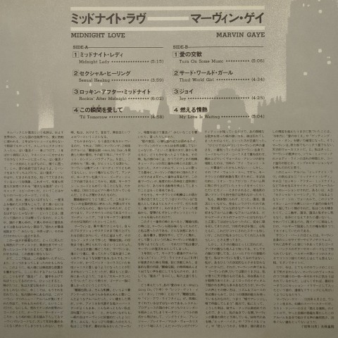 ソウル・ミュージックの代名詞的存在Marvin Gayeの生前最後の作品となった82年作。長いキャリアの中で数えきれないほどの名曲を世に送り出してきたMarvin Gayeの後期を代表する、極上メロウなリズム・ボックス・ソウル・クラシック「Sexual Healing」収録。ラストの「My Love Is Waiting」も名曲です!