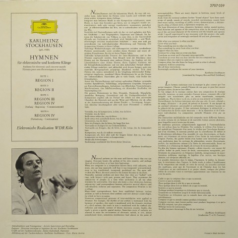 現代音楽最重要人物、ドイツのKarlheinz Stockhausenが69年にリリースした代表的な電子音楽作品の一つ『Hymnen』。世界中のあらゆる国歌の断片を素材にミュージック・コンクレート/コラージュ/電子変調した2枚組合計2時間弱のアヴァンギャルド超大作。歴史的名盤!