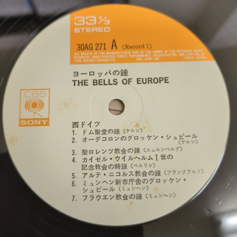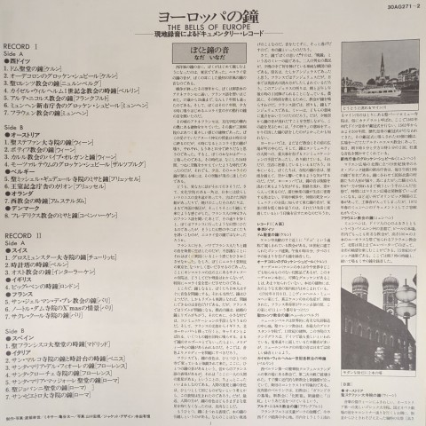 ドイツ、オーストリア、ベルギー、オランダ、スウェーデン、スイス、イギリス、フランス、スペイン、イタリアのヨーロッパ各国の教会やゴシック建築の鐘の音を収録したレコード。大音量で聴くとミニマルでサイケデリックな鐘の音と街中の雑踏のフィールドレコーディング=ノイズが混然一体となってなんだか物凄い音響体験ができます。鐘の音色やリズム、音階などもヴァラエティ豊かで面白い!これはフィルレコ名作!
