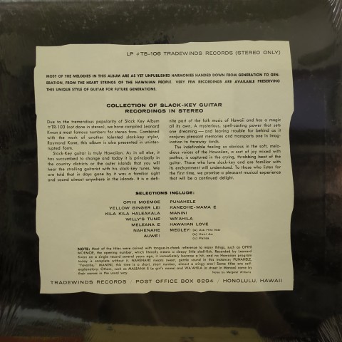 弦を緩めたオープン・チューニングによるハワイ独特のギター奏法、スラック・キー・ギターの第一人者Leonard KwanがRaymond Kaneと共作でリリースした61年作。ゆるゆるのギターが気持ちよすぎて何もしたくなくなる、この暑すぎる夏にピッタリの納涼レコード。サイコーです。