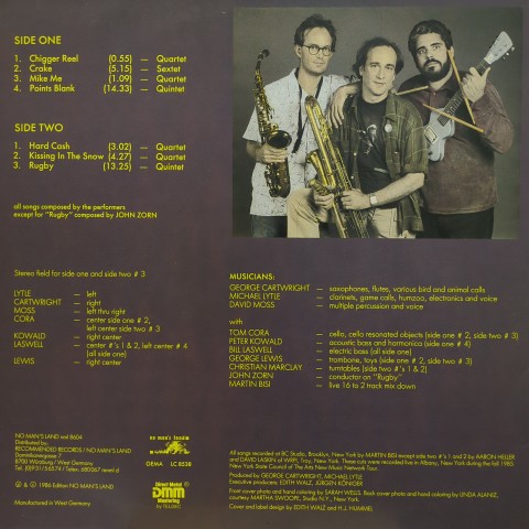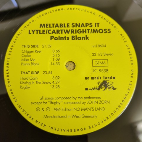 NYの奇才パーカッショニストDavid Moss、実験音楽集団Iowa Ear Music Ensembleでも知られるMichael Lytle、NYアヴァン・ロック・バンドCurlewのリーダーGeorge Cartwrightを中心にしたユニットMeltable Snaps Itの86年作。John Zon、Christian Marclay、Bill Laswell、Tom CoraなどNY前衛オールスターのようなメンツが参加。全編に渡って強烈にフリーキーながらひねくれたユーモアも感じれるNY前衛らしい即興演奏を展開しています。試聴はChristian Marclayのターンテーブルをフィーチャーした「Hard Cash」、John Zornのコンダクションによる「Rugby」、Tom Cora、Geroge Lewisが参加した「Crake」から。
