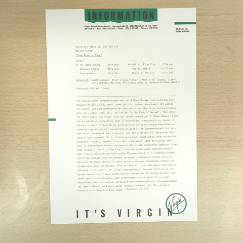 元CANのHolger Czukayが87年にリリースした5thアルバム。元CANのJaki Liebezeit、Michael Karoli、PILのベーシストJah Wobbleが参加。今作ではグレゴリオ聖歌、当時のローマ法王、ヨハネ・パウロ二世の語り、James Brownの声やブルガリアン・ヴォイスなんかをサンプリング。このイカれた遊園地のような、ひねくれた遊び心が詰まった音世界はHolger Czukayならでは!ジャケットのコラージュも◎。