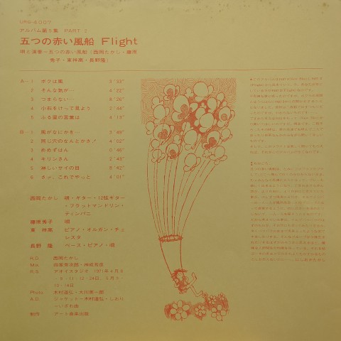 元々は同年発売の『New Sky』と2枚組を想定して作られた五つの赤い風船の71年作。ワウ・ギターが効果的に使われたサイケ・フォーク「つまらない…」やエレピがたゆたうアンビエント・フォーク「そんな気が…」、アッチの世界で鳴っていそうなエフェクトがかけられた「ふる里の言葉は」など、西岡たかしのアシッドな感覚に彩られた作品。名作です。