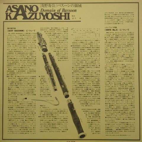 現代音楽作曲家、諸井誠がバスーン奏者の浅野寿公のために作曲した「バスーンの領域」を収録した76年作。名パーカッショニスト山口保宣も参加。A面すべてとB面の半分を占める「バスーンの領域」は浅野寿公によるかなりユニークなバスーンの演奏が聴ける奇曲!Albert MangelsdorffやGeorge Lewisなどのフリージャズ好きにもオススメです。
