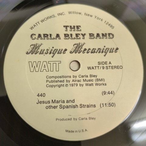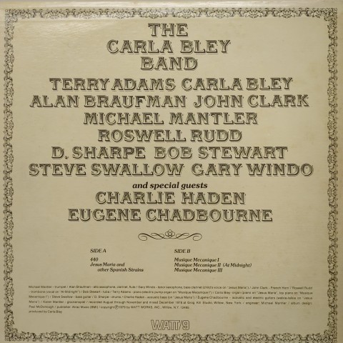 ジャズ・コンポーザーとして独自の魅力を確立した異才Carla BleyがECM傘下の自身のレーべルWATTからリリースした79年作。彼女らしいストレンジでユニークなアレンジが最高なアルバム!試聴はレコードの針飛びを模した演奏に初めて聴いたときはあせる「Musique Mecanique III」、アメリカの奇人変人ギタリストEugene Chadbourneも参加した「Jesus Maria And Other Spanish Strains」から。