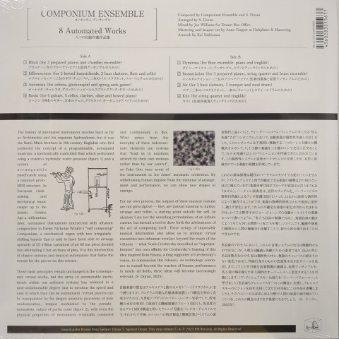 本プロジェクトは、古代ギリシャのアルキメデスに始まり、9世紀バグダッドのバヌー・ムーサー兄弟によって発展した自動演奏楽器の長い歴史から着想を得ています。後者は水圧を利用し機械的に制御されたフルートと先見性のあるプロト MIDI 構造を持つパンチカード機構という、プログラム可能な自動演奏のコンセプトを初めて完成させていますが、この機械的な音楽制作は、千年後、筐体それ自体で自動作曲できる「コンポニウム」という機械音楽システムを発明したディートリッヒ・ニコラス・ウィンケルによって偶然性の原理を用いて拡張されました。ドーランは《コンポニウム・アンサンブル》でこの系譜をさらに発展させ、デジタル技術で膨大な数の仮想楽器を自動化し不確定性の要素を導入する機能を活用することで、人間の衝動や恣意の限界を超えた仮想演奏者という「新たな形態の出現」に扉を開いています。このサイバーヒューマン・ミュージックともいえる形態の先駆者であるノア・クレシェフスキーに捧げられた『八つの自動作曲作品集』は、プリペアドピアノ、ハープシコード、チェレスタ、バスクラリネット、フルート、チェロ、バリ島のティンクリックなど、多岐にわたる楽器を複数の仮想アンサンブルで演奏しています。一見難解にみえる理論的基盤にもかかわらず、その音楽は聴きやすくかつ魅力的で、想像を超える広がりと新鮮さを持っています。軽やかなタッチと洗練された旋律感覚は、ポップスファンとクラシック/コンテンポラリー音楽のリスナーの双方に響くことでしょう。音源はドーランの長年のコラボレーターであるジョー・ウィリアムズ(Motion Graphics、Lifted)がミキシングを行い、音楽を視覚面から解説するハイパーリアリスティック・アートは日本のビジュアルアーティスト/グラフィックデザイナ ー、吉澤風生(Kai Yoshizawa)が担当。