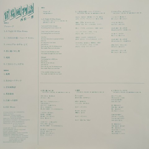 林立夫を中心に結成されたエスノ・アンビエント・ユニット、ARAGONのメンバーとしても知られる西松一博の85年ソロ2ndアルバム。桃源郷的オリエンタル・バレアリック・ポップ・ナンバー「貿易風物語」をはじめ、異国情緒あふれるエスニックなムードとバレアリックな音響処理が融和しワン&オンリーの無国籍な世界観を創り上げた海外でも人気の大名作。