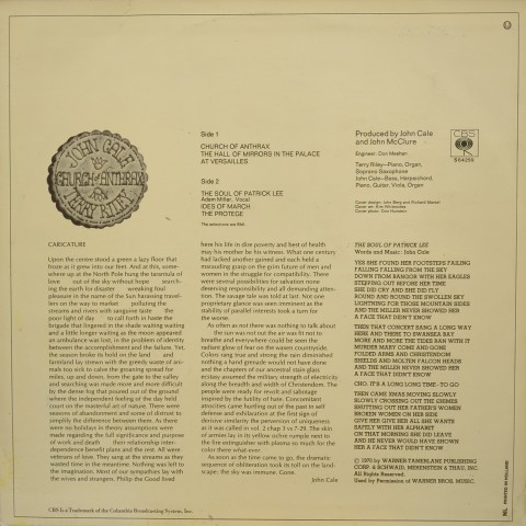元Velvet UndergroundのJohn Caleとミニマル・ミュージック最重要人物のひとりTerry Rileyによる71年コラボ作品。ミニマル・ミュージックをロックにアプローチしたアルバム。John Caleによるベースもカッコいい、Terry Rileyのオルガンが唸りまくりのジャーマン・ロックにも通じる「Church Of Anthrax」、ソプラノ・サックスとピアノによる清涼ミニマル「The Hall Of Mirrors In The Palace At Versailles」、John Cale作のフォーキーなうたもの「The Soul of Patrick Lee」、2台のピアノが濃密に絡みあう「Ides Of March」など、この二人が一緒にやって悪いわけがない!大名作!