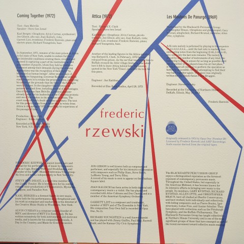イタリアの即興音楽家集団Musica Elettronica Vivaの創設メンバーとしても知られるアメリカの作曲家Frederic Rzewskiの1974年作。71年にNYのアッティカ刑務所で発生した暴動をテーマにした一枚。ミニマル・ミュージックをバックに暴動に関わったSam Melvilleの手紙を朗読していく「Coming Together」は徐々に徐々に高揚していく、公民権運動とは切っても切れないファンクやブラック・ジャズとも通底する感覚の名曲。現代音楽からブラック・パワーへの連帯の意志が感じられる傑作!