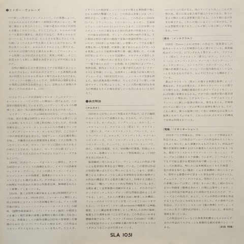 1883年フランス生まれのアメリカ人現代音楽作曲家Edgar Vareseの1920〜30年代の初期作をZubin Mehata指揮による演奏で72年に録音した一枚。その中でもやはり注目は、少年時代のFrank Zappaにロックン・ロールやドゥーワップとともに絶大な影響を与えた「Ionisation」。〈西洋音楽〉の中から和音と旋律を排除した作品として先駆的な、荒々しい打楽器とノイズとしてのサイレンのみで構成された前衛的名曲です。