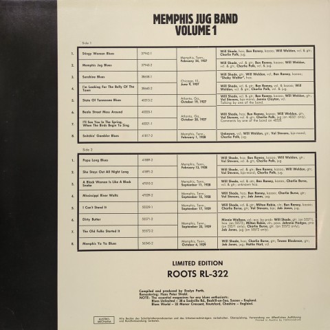 アメリカの奇人Harry Smith編集の名コンピ『Anthology Of American Folk Music』にも数曲が収録された、1920年代後半から1930年代半ばにかけて活動していたMemphis Jug BandのSP音源を収録した67年のコンピレーション。ウイスキーなどの空瓶を使用したジャグ、おもちゃのようなカズーを用いた、戦前音楽ならではのファニーでユニークな魅力が詰まった一枚。